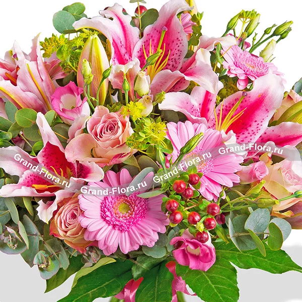 Стандартный: лилия розовая - 2 шт., роза розовая - 5 шт., гербера розовая - 4 шт., эустома розовая - 3 шт., гиперикум красный - 3 шт., эвкалипт - 3 шт., рускус - 3 шт., бант розовый.